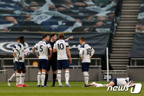 | 손흥민이 쓰러진 장면을 VAR로 지켜보고 있는 주심. © AFP=뉴스1 |