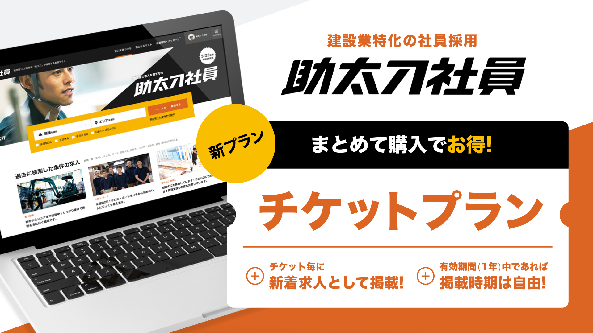 昨今「助太刀社員」をご利用いただいている工事会社様から、「年間を通じて複数回掲載したい」「同時に複数職種の掲載をしたい」というご要望をいただくようになりました。このようなニーズにお応えし、よりお得で柔軟に求人掲載が可能となる、新プラン「チケットプラン」の提供開始に至りました。