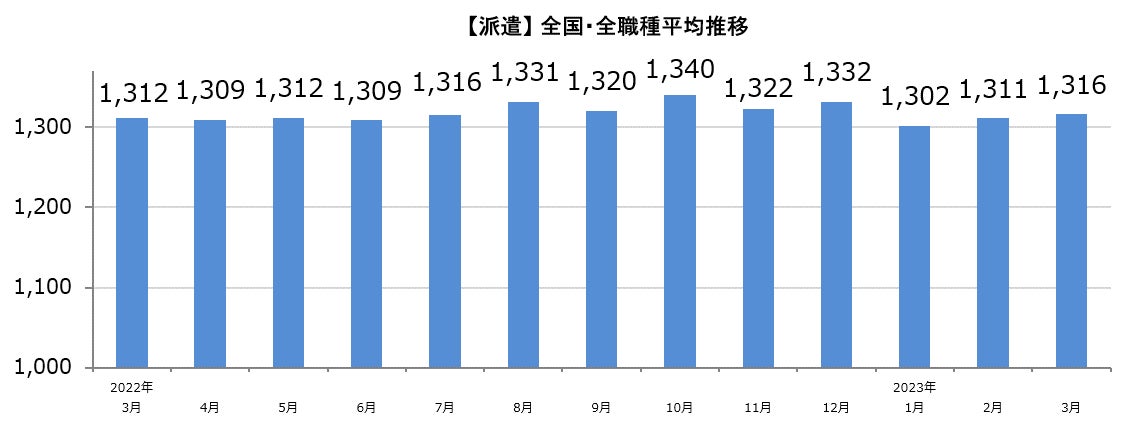 【派遣】全国・全職種平均時給は1,316円。前月比+5円。前年同月比+4円。
