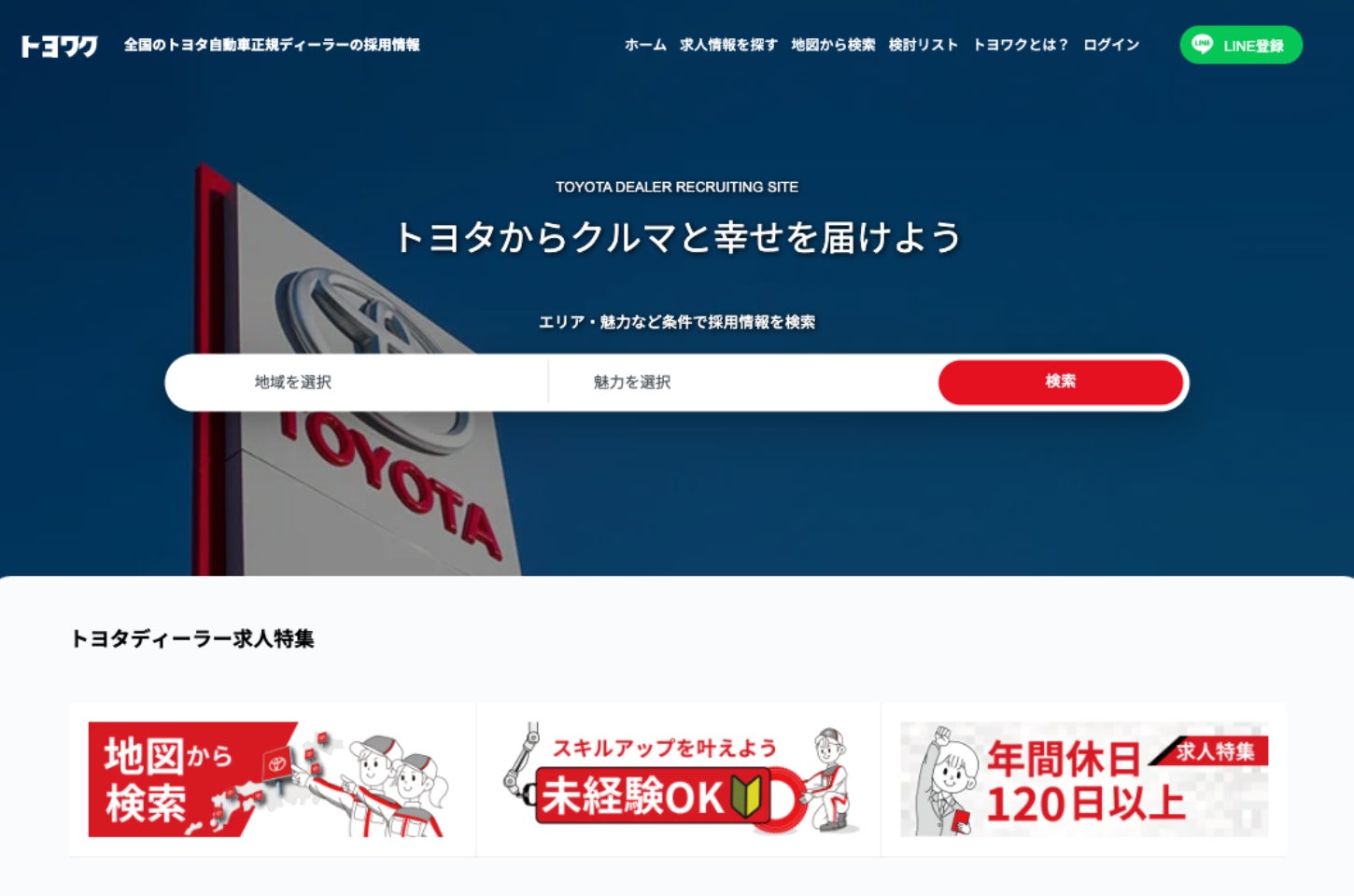 その一環として、トヨタディーラーを運営する各社の魅力を求職者にしっかり伝えることで、トヨタディーラーで働きたいと思っていただくエンジニアを増やすことはもちろんのこと、自動車整備業界そのものに興味を持って働きたいと思っていただく人を増やしていきたいと考え、全国のトヨタディーラーからエンジニアの魅力をお伝えするトヨタエンジニア専門の求人サイトを作るに至りました。