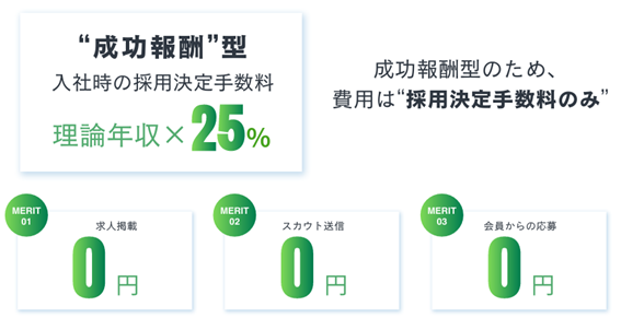 採用決定時のみ、求職者の理論年収の25%が手数料として発生します。求人情報の掲載やスカウト機能、会員からの求人応募等はすべて無料のため、低リスクで利用できます。